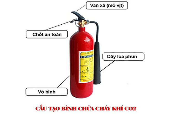 Bình chữa cháy khí CO2 có loại nhỏ và loại lớn. Các bộ phận cấu tạo là: