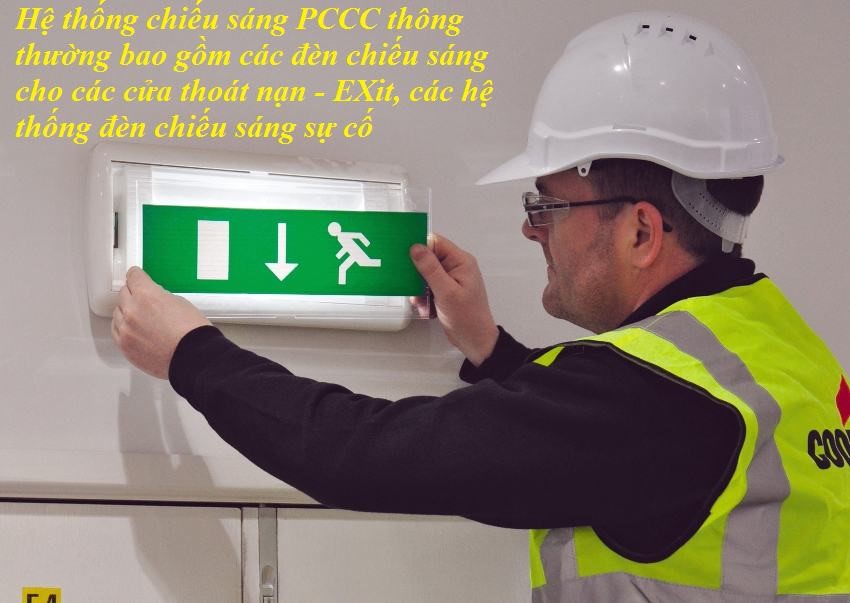 - Hệ thống chiếu sáng PCCC thông thường bao gồm: Các đèn chiếu sáng ch các cửa thoát nạn Exit, các hệ thống đèn chiếu sáng sự cố (đèn chiếu sáng khẩn cấp). Các đèn Exit thì hoạt động không ngừng 24/24h còn các đèn chiếu sáng khẩn cấp chỉ hoạt động khi hệ thống điện chính bị ngắt (khi có sự cố cháy nổ xảy ra). Nó có tác dụng hướng dẫn, chỉ đường cho người trong khu vực thoát nạn nhanh nhất tới nơi an toàn. Việc bảo trì bảo dưỡng hệ thống chiếu sáng sự cố rất quan trọng vì nguy cơ cháy có thể xảy ra bất cứ lúc nào. Việc thiếu ánh sáng khẩn cấp sẽ dẫn tới nguy cơ không thể thoát nạn hoặc chạy vào nơi nguy hiểm hơn.