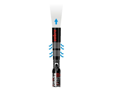 – Hướng phần đầu của nắp sabre về phía thiết bị báo khói và ấn nút của chai xịt khói Smoke Sabre để khói phun ra